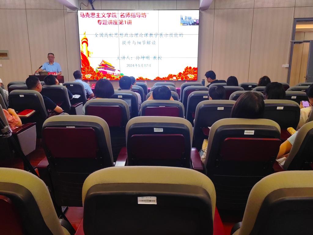 (通讯员:鲍秀丽)为提升思政课教师教学能力,进一步加强思政课课程建设,强化思政课育人成效,5月17日下午,学院特邀获第三届全国高校思政课教学展示活动“教学竞赛单元”现场教学展示一等奖获得者、西安建筑科技大学马克思主义学院孙坤明教授做客三峡大学“名师指导坊”作首场讲座。我院全体思政课教师、部分研究生及院内外线上线下百余名教师参加了学习,本次活动由副院长黎见春主持。